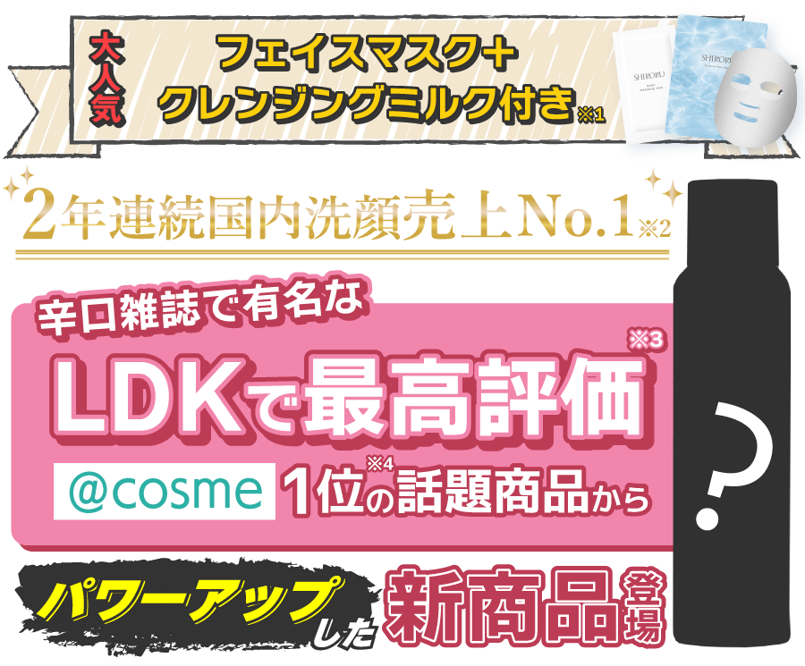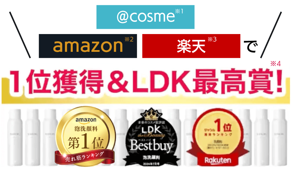 ※1:クリスタルホイップの実績。@cosmeクチコミランキング第1位 洗い流すパック・マスク部門 集計期間(2024年2月1日~2024年4月30日)※2:クリスタルホイップの実績。Amazon売り上げランキング1位獲得(2023/9/29実績)※3:クリスタルホイップの実績。洗顔料ジャンル週間ランキング第一位(2023/4/26更新 集計日:4/17~4/23)※4:クリスタルホイップの実績。2024年7月号泡洗顔部門にて